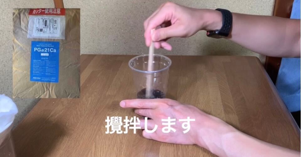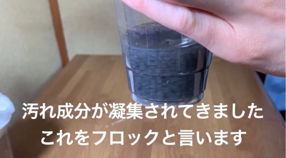 2 1〜2分待ってください。様子を見ながら2〜3回攪拌を繰り返すとフロック(汚れが凝集した塊)が大きくなってきます。