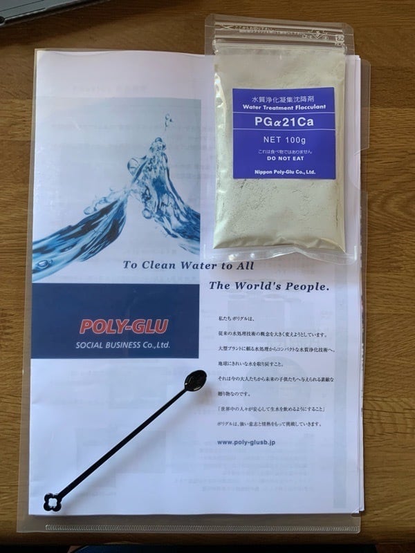日本ポリグル株式会社の水質浄化剤『PGα21Ca 100g 資料サンプル付属』です。この1袋で1トンの汚水が浄化できますので企業向けの大容量【PGα21Ca 20kg】の購入の前にこちらでお試しいただきたいと思います。質問やご相談も随時受け付けております。